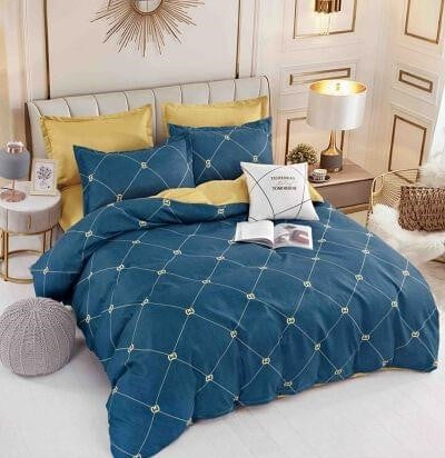 Lenjerie Din Bumbac Tip Finet 6 Piese Pentru Pat Dublu - Bleumarin cu Auriu