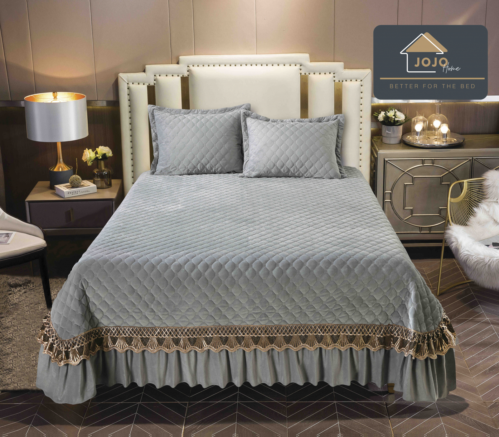 Cuvertura Pat 2 Persoane Din Catifea De Lux 3 Piese - Gri Deschis