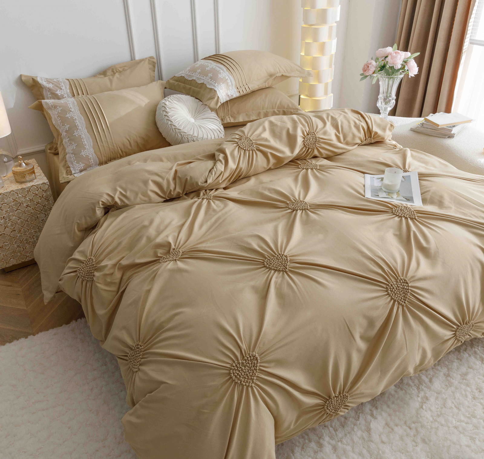 Lenjerie Pat Dublu, Bumbac Soft Touch, 6 piese, cu Pliuri Brodate - Bej