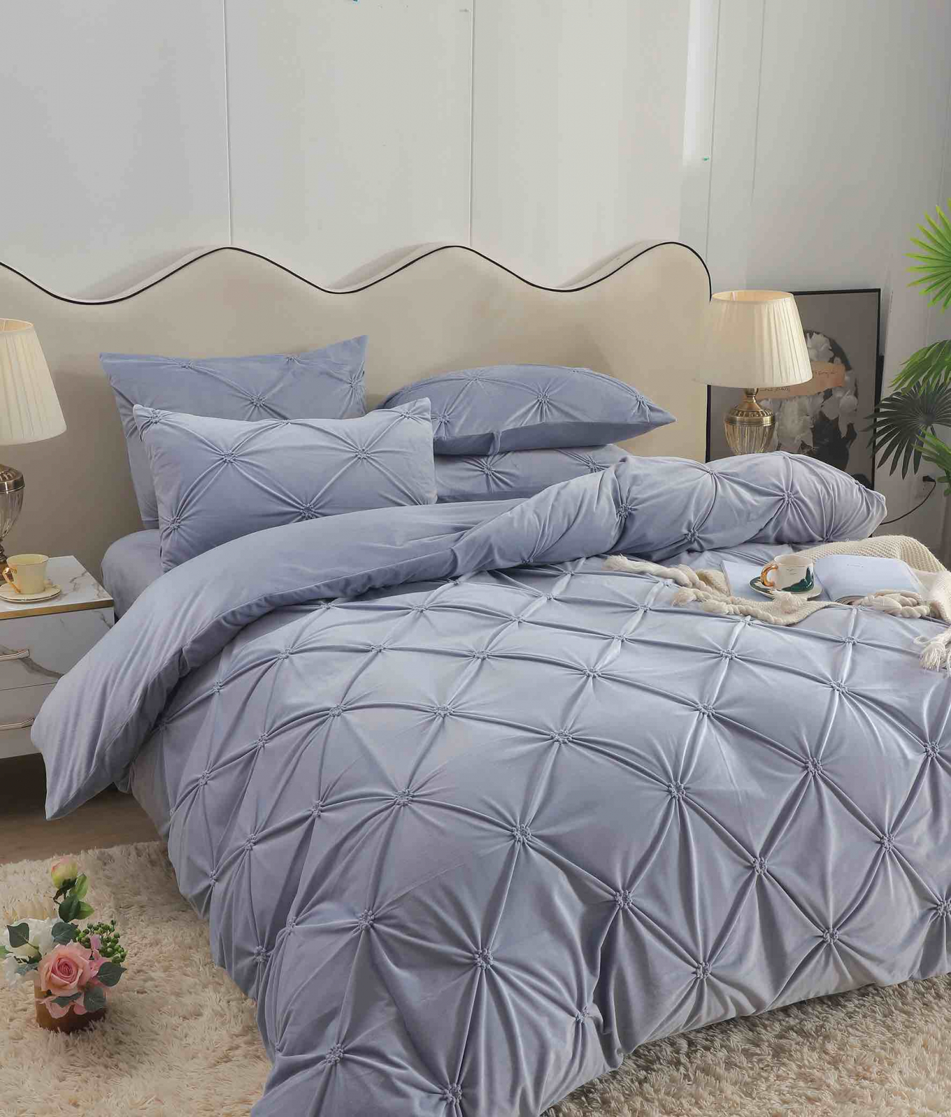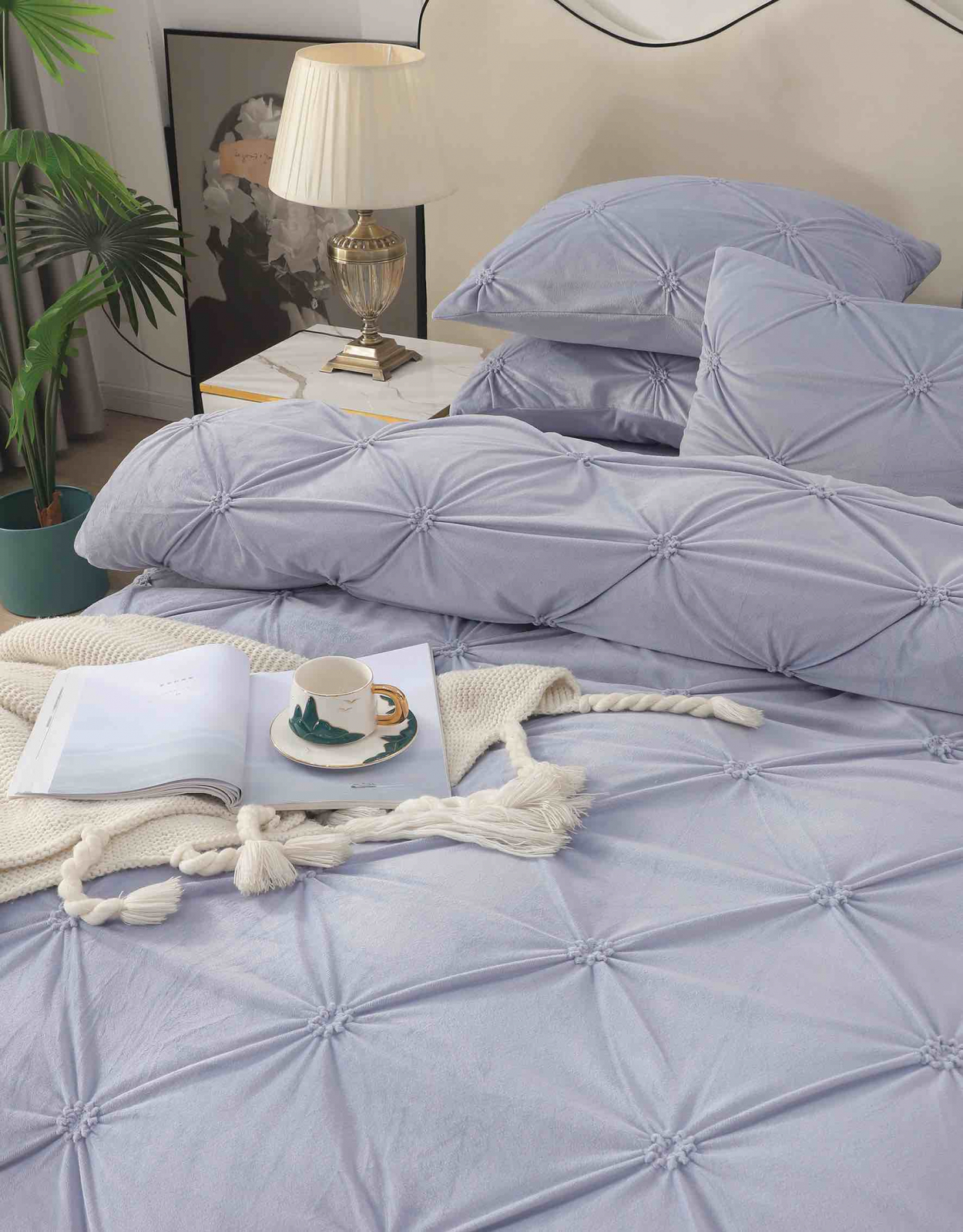 Lenjerie pat dublu, CU ELASTIC, Catifea Deluxe, cu pliuri brodate, 4 piese - Albastru Pastel