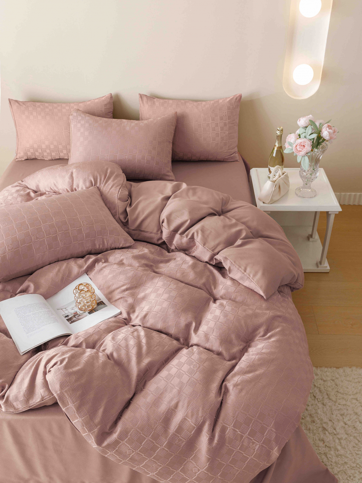 Lenjerie Pat Dublu, Jacquard Finetat, 6 Piese - Roz Pudrat