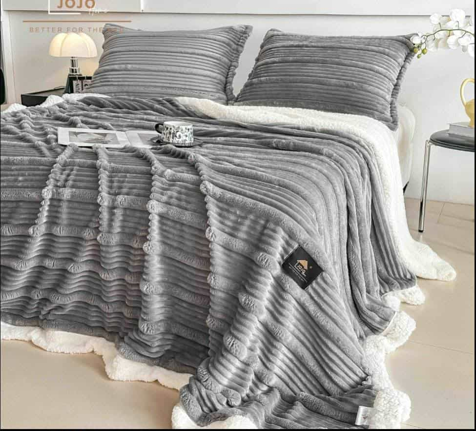 Setul Jo-Jo Home gri 3D combină designul modern cu o textură rafinată și un confort desăvârșit. Pătura este realizată din blăniță artificială de iepure cu model 3D în relief, plăcută la atingere și elegantă, având verso din blăniță albă tip Sherpa — densă, moale și extrem de călduroasă.
